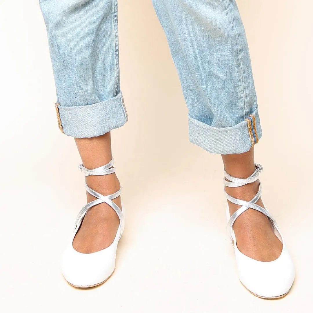 Wear these 2-in-1 flats as a classic white ballet or dressed up with a tie up silver Tomoe strap (pictured). Style meets sustainability with these chrome-free leather flats. PLEASE NOTE THE SILVER TOMOE STRAP IS FINAL SALE.