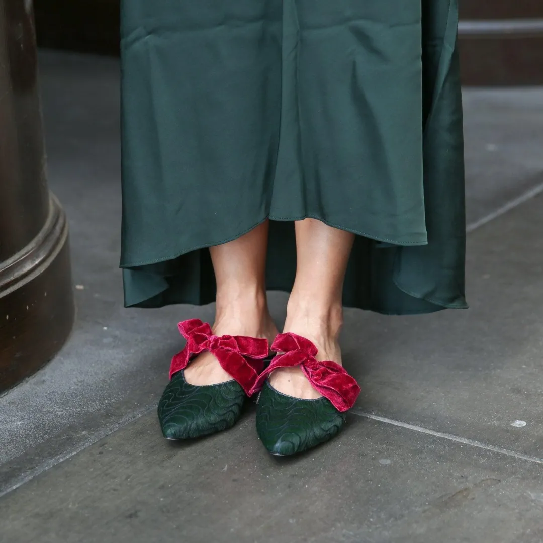 Slip on these groovy 2-in-1 pointed slides when you're on the go or wear them with the detachable Marie strap for a holiday look. The versatile dark green calf hair is laser engraved to reveal a navy suede pattern underneath. But these shoes aren't just about style, they are ultra comfortable. We extended the point so your toes are not squished and dropped the heel lower than our classic slides and loafers. Customize them with any Alterre strap to create your own personalized shoe.